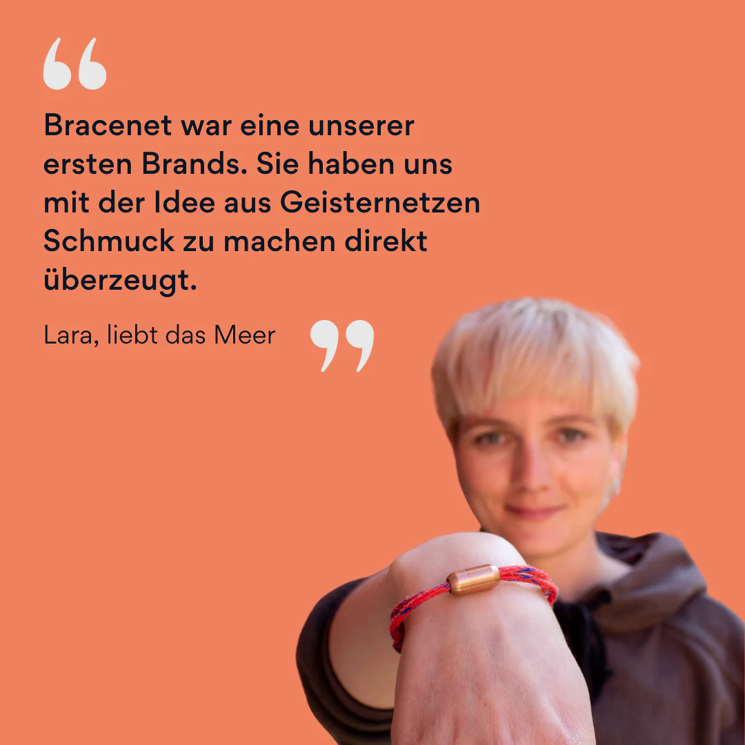 Jedes Armband ist ein Unikat und kann optisch sowie in der Größe aufgrund unterschiedlicher Maschenanzahl und Maschendicke leicht variieren. Es wurde aus einem im Ozean geborgenen Fischernetz handgefertigt. Alle Netze werden vor der Produktion in einem umweltfreundlichen Verfahren gereinigt.
