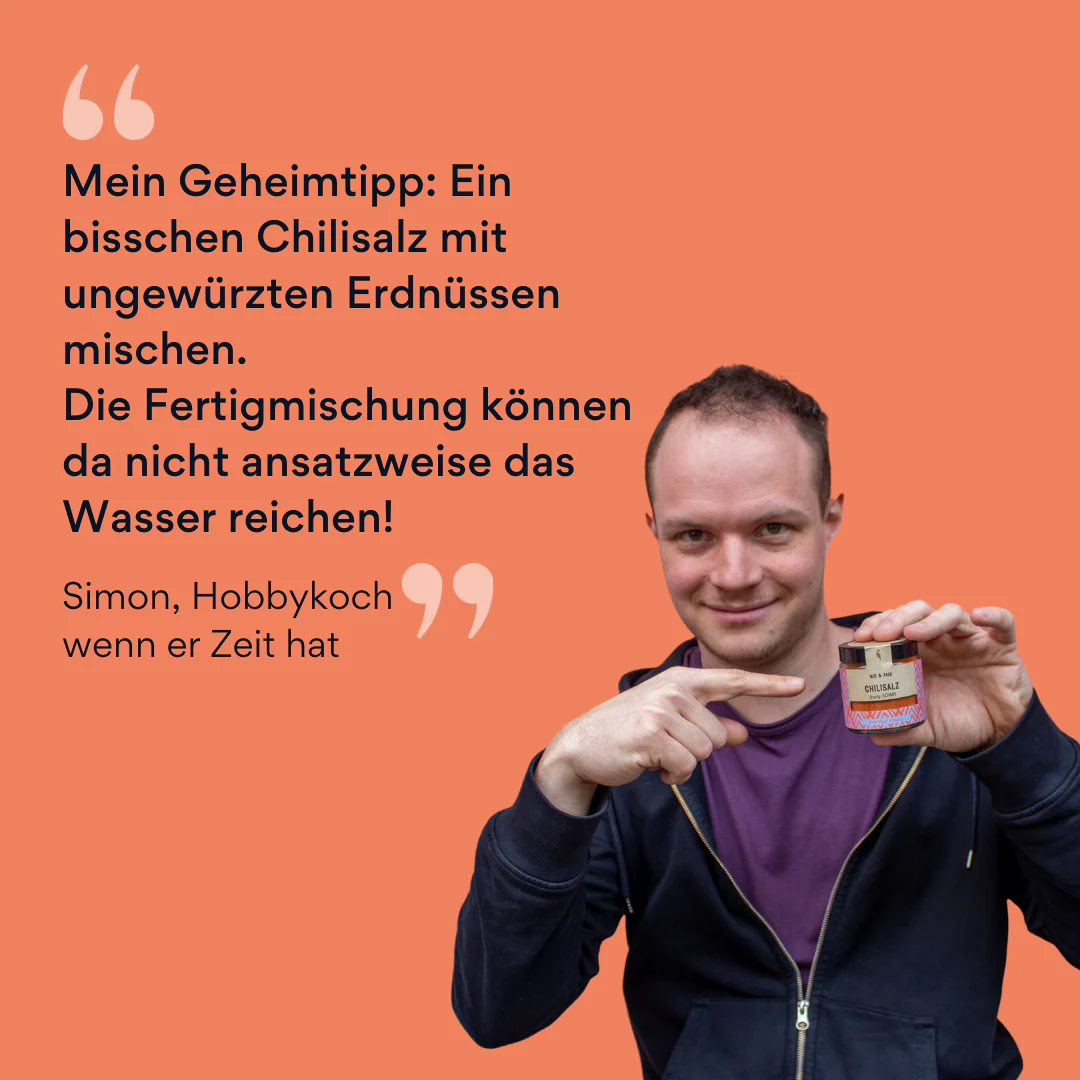 Das Chili-Salz ist eine Mischung aus edlem Atlantik Fleur de Sel und scharf-fruchtigen Birdseye-Chiliflocken. Abgerundet wird es mit einer Prise gemahlenem Knoblauch, der dem Salz eine besondere Tiefe verleiht und die fruchtigen Noten im Chili betont.
