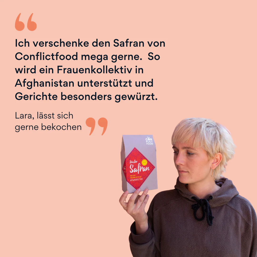 Wo einst Opiumpflanzen wuchsen, baut heute ein selbstverwaltetes und unabhängiges Frauenkollektiv diesen edlen Safran nach alten Traditionen und in reiner Handarbeit an. Conflictfood-Safran kommt aus der Provinz Herat im Westen von Afghanistan. Die gesamte Region wird auch als „Wiege des Safrans“ bezeichnet und zählt zu den besten Anbaugebieten weltweit. Prämiert wurde die Anbauregion vom International Quality & Taste Institute in Brüssel.